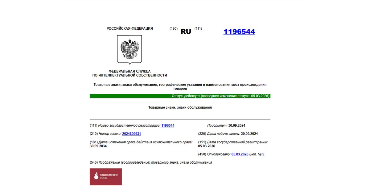 В реестре Роспатента появилась показательная регистрация для бизнеса: товарный знак STOCKMEIER FOOD(№ 1196544), статус — «действует», приоритет — с 30.09.2024, госрегистрация — 05.03.2026. Это классический пример того, как бренд превращается из чисто маркетингового обозначения в юридически защищённый актив. Пока знак не зарегистрирован, бренд фактически открыт для заимствований. Конкуренты могут: Для компании это риск потери трафика, выручки и forced‑ребрендинга с заменой упаковки, домена, витрин и рекламных материалов. После регистрации правообладатель получает исключительное право на обозначение в заявленных классах МКТУ. Это позволяет: Для партнёров наличие регистрации — сигнал: бренд не «серая зона», а понятный с юридической точки зрения актив. Если бренд уже используется и приносит деньги, регистрация — не опция, а элемент управления рисками. В большинстве случаев стоимость регистрации и сопровождения заметно ниже, чем цена конфликта и смены названия на работающем рынке. Отдельно