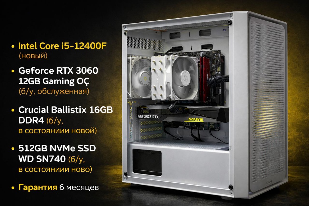 Отличный вариант для современных игр и повседневной работы. Шестиядерный процессор обеспечивает высокую производительность, а видеокарта RTX 3060 позволяет комфортно играть во многие современные игры на высоких настройках. Характеристики компьютера: — Процессор: Intel Core i5-12400F (новый) — мощный и современный 6-ядерный процессор — Материнская плата: MSI PRO H610M-E DDR4 (новая) — Видеокарта: Gigabyte GeForce RTX 3060 Gaming OC 12GB (б/у, в состоянии нового, полностью обслужена) — отличная производительность в играх и поддержка современных технологий — Охлаждение: Thermalright Assassin 120 Refined SE White (новое) — эффективное и тихое охлаждение процессора — Оперативная память: Crucial Ballistix 16GB DDR4 (б/у, в состоянии новой) — комфортная работа в играх и многозадачности — SSD: WD SN740 512GB NVMe (б/у, в состоянии нового) — высокая скорость загрузки системы и программ — Блок питания: DeepCool PF500 (новый) — Корпус: Ocypus Gamma C50 (новый) Компьютер полностью обслужен, про