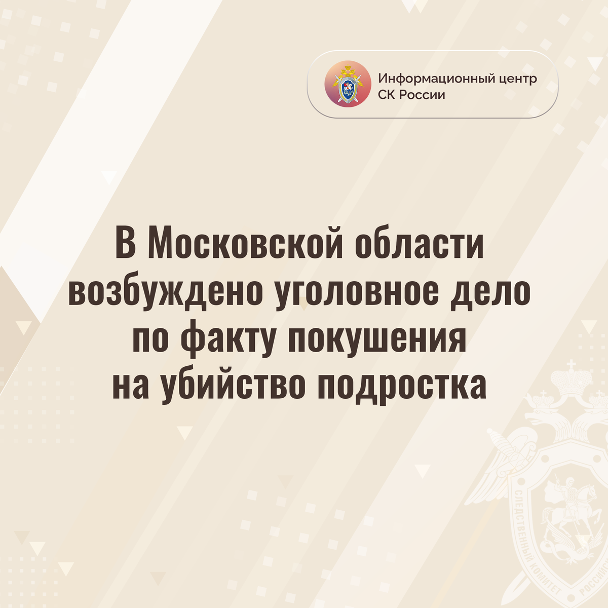 В Московской области возбуждено уголовное дело по факту покушения на убийство подростка Следственными органами Главного следственного управления СК России по Московской области возбуждено уголовное дело по факту покушения на убийство 13-летнего подростка (ч. 3 ст. 30, п. «в» ч. 2 ст. 105 УК РФ). По данным следствия, 16 марта текущего года в городском округе Лосино-Петровский в утренние часы по дороге в школу подросток нанес другому ножевое ранение в шею. С полученными травмами потерпевший был госпитализирован в медицинское учреждение. В настоящее время с нападавшим работают следователи, устанавливаются мотивы совершенного им преступления. Следователями и криминалистами проводятся осмотр места происшествия, обыски, осуществляются допросы, планируется назначение судебных экспертиз, устанавливаются причины и условия, способствовавшие совершению преступления. #СледственныйКомитет #СКРоссии #СКР #ИЦСКР #ИнформационныйЦентр