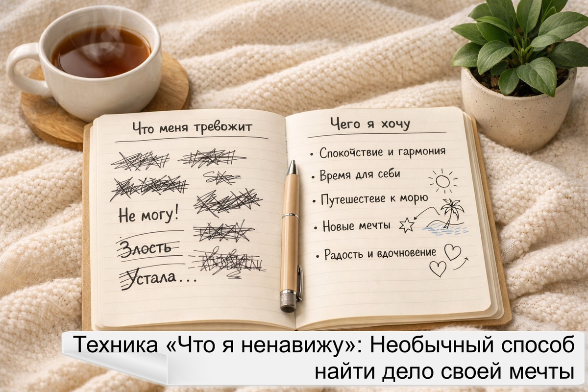 Мы гораздо лучше знаем, что нам не нравится, чем то, чего мы на самом деле хотим. Мы легко перечисляем, от чего устали, что бесит, раздражает или выматывает. И тут скрыт ключ к пониманию себя. Наш внутренний навигатор устроен так, что сигнал «не хочу» всегда громче и четче робкого «может быть, попробовать?». Мы привыкли отмахиваться от негативных эмоций, считая их чем-то ненужным, хотя на самом деле они указывают направление точнее любого компаса. Просто мы редко рассматриваем раздражение как подсказку, а зря. Техника «Что я ненавижу» – это способ посмотреть на свою жизнь через обратную сторону привычных представлений. Обычно, когда мы пытаемся понять свои желания, мы застываем перед пустым листом, потому что голос разума сразу включает критику: «это дорого», «это не для меня», «так не принято». Но когда речь заходит о том, что нам неприятно, никаких сложностей не возникает для того, чтобы это перечислить. Здесь не нужно ничего приукрашивать или подгонять под чужие стандарты. Мы точно