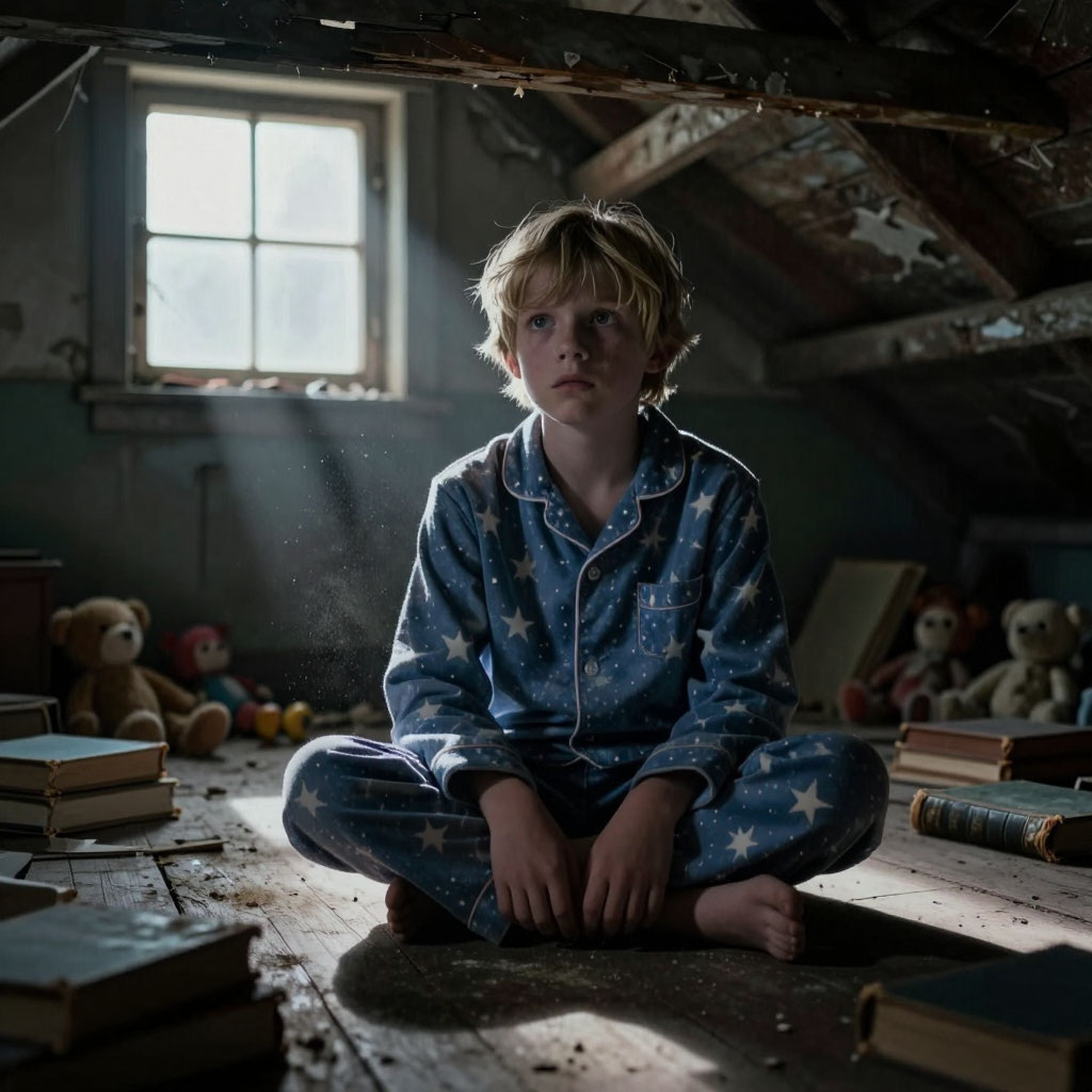 Гриша сидел на чердаке и прислушивался к каждому звуку снизу. Тишина давила, а пыльный воздух казался густым и тяжёлым. Он старался не шевелиться, чтобы не привлекать внимания — вдруг кто‑то решит проверить чердак?