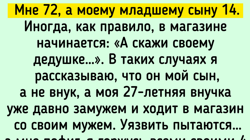 👉 Все эти истории из жизни рассказали читатели наших каналов на Дзене. Мне 72, а моему младшему сыну 14. Иногда, как правило, в магазине начинается: «А скажи своему дедушке…». В таких случаях я рассказываю, что он мой сын, а не внук, а моя 27-летняя внучка уже давно замужем и ходит в магазин со своим мужем. Уязвить пытаются… а мне пофиг, я горжусь всеми своими 4 детьми, и они мной! Старшему сыну — 48. © Sergei Borodin / Dzen Дочь мы родили поздно, в 35 лет. Когда ей было 16, пошли на рынок, а там мне продавщица предложила купить внучке яблок. © Валерий Гостев / Dzen Меня обычно принимают за подростка (короткая стрижка, отсутствие косметики, одежда унисекс). Но летом у меня родилась сестрёнка (разница у нас 24 года и 3 дня, вот такой вот подарок на день рождения). И мы поехали в отпуск на море. Мама ушла купаться, а я осталась приглядывать за мелочью. Она проголодалась и начала вопить. Я грудью кормить не умею, бутылочки при себе нет. Успокаиваю, а мамы всё не видно. Подходит какая-то
