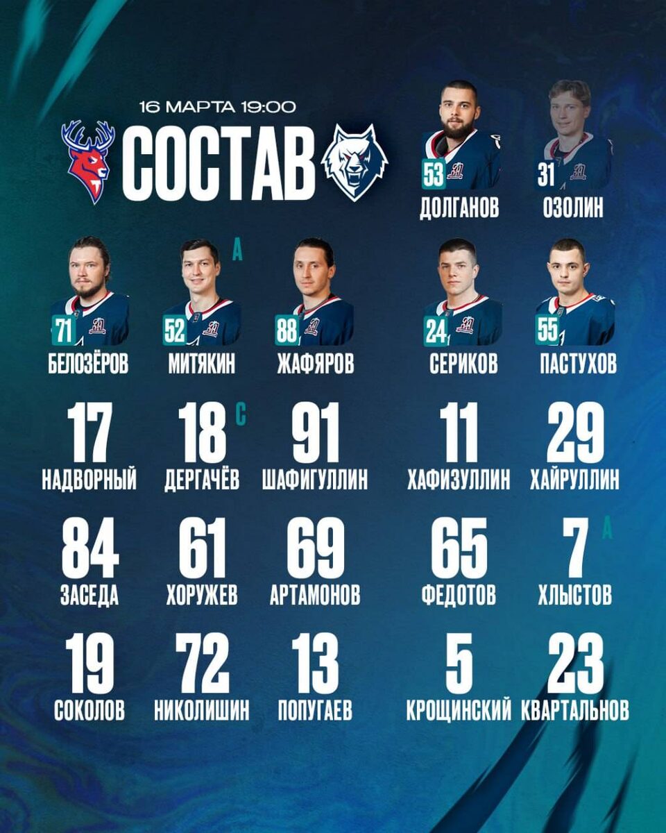 Нижнекамский «Нефтехимик» и казанский «Ак Барс» представили составы на выездные с «Торпедо» и «Северсталью». «Нефтехимик» сегодня встретится с «Торпедо» - игра в Нижнем Новгороде начнется в 19 часов. «Ак Барс» также на выезде встречается с череповецкой «Северсталью» – игра стартует в 19.30. «Пришло время представить состав «стаи» на матч с «Торпедо». Сегодня на лед после повреждения возвращаются Динар Хафизуллин», - сообщает телеграм-канал «Нефтехимика». Также в составе Заседа и Хафизуллин, не сыграют Селезнёв и Юзленко. «Артём Галимов и Тимур Билялов в заявке на матч», - сообщает телеграм-канал «Ак Барса». Также сыграет Замалтдинов, не выйдут на лед Столпеченков и Терехов. Напомним расклады плей-офф: «Ак Барс» попадает на «Трактор», а «Нефтехимик» – на «Авангард». Ранее «РТ» сообщала. что заключительные матчи регулярного чемпионата КХЛ проведут 20 марта «Ак Барс» и «Нефтехимик», а затем начнутся серии на выбывание в борьбе за самый почетный трофей лиги – Кубок Гагарина. И если настрое