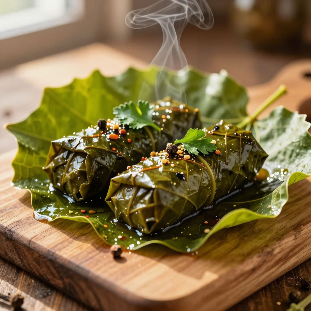 Долма — это не просто блюдо, это поэма о солнце, спелых виноградных листьях и щедрости восточных традиций. Каждый рулетик — маленький свёрток счастья, таящий в себе сочную начинку и ароматы далёких стран. Для начинки: Для соуса: Основные компоненты: Шаг 1. Подготовка виноградных листьев Если у вас свежие листья — срежьте черешки и промойте под струёй прохладной воды. Затем залейте их кипятком на 5 минут — пусть раскроют свою мягкость и податливость. Маринованные листья разверните, бережно промойте каждый, залейте кипятком и оставьте на 20 минут — так уйдёт лишняя кислота, а листья станут нежными, словно шёлк. Шаг 2. Создание души начинки Приготовьте фарш самостоятельно — так он получится ароматнее и насыщеннее. Добавьте к нему: Тщательно перемешайте всё руками — так масса станет однородной и пластичной, готовой к волшебству заворачивания. Шаг 3. Искусство заворачивания Возьмите виноградный лист, положите немного начинки ближе к основанию. Подверните боковые края к центру, затем аккурат
