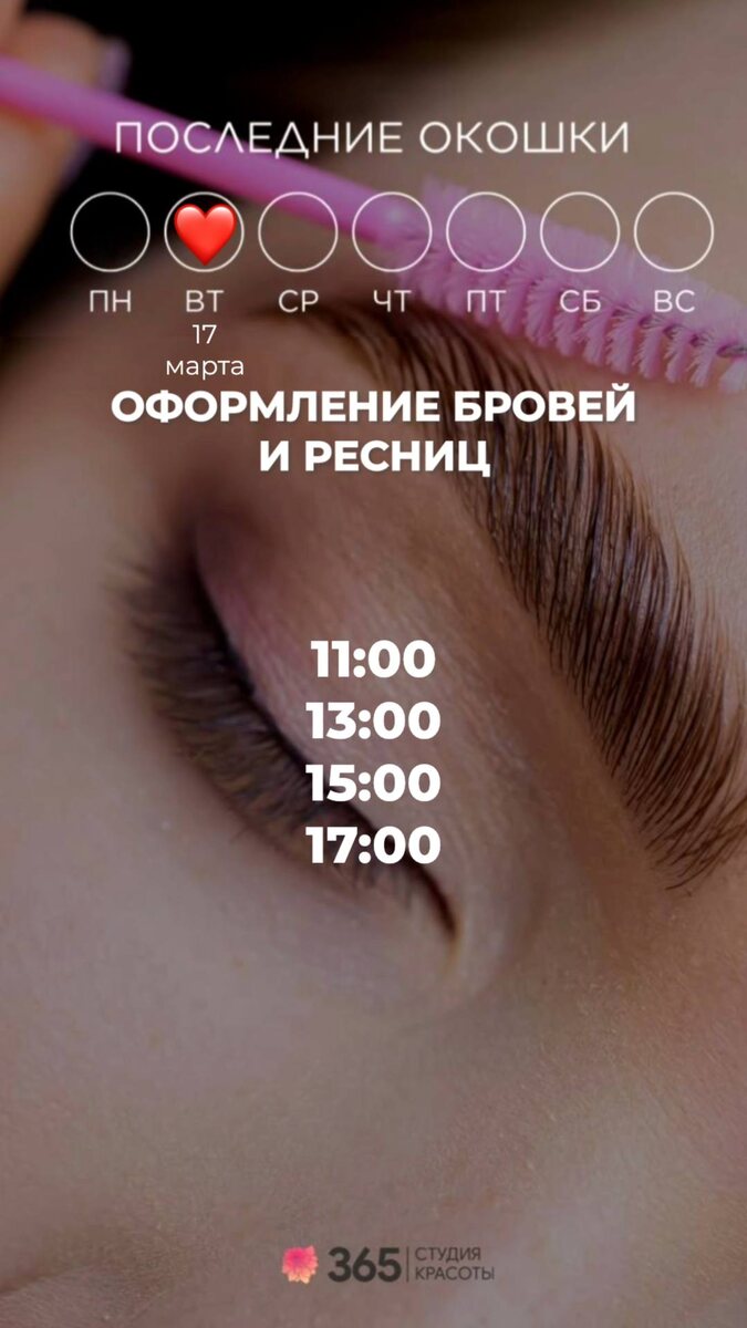 🌺 Весеннего настроения!!! 🥰 Ловите аффирмацию 🤗 Я люблю красоту мира. Я окружаю себя красивыми вещами. Я раскрываю в себе новые грани красоты и гармонии!!! 🥰❤️ #красота #наслаждение #забота #весна #любовь #мечты сбываются #радость #возможности ЧТО МОЖНО УСПЕТЬ СДЕЛАТЬ 11 марта 2026 года : Ногтевой зал: 10:00 12:00 14:00 16:00 20:00 Сет в 4 руки: 12:00, 14:00, 16:00 Парикмахерский зал: 17:00 19:00 Оформление бровей и ресниц: 11:00, 13:00, 15:00, 17:00 Косметология/шугаринг: ближайшая запись на 18 марта ЗАПИСАТЬСЯ МОЖНО ЛЮБЫМ УДОБНЫМ СПОСОБОМ: 👉🏻 Сообщение в Whats'app https://wa.me/79663654477 👉🏻По телефону +79663654477 👉🏻Онлайн запись https://n286444.yclients.com/ #команда365 #красота #наслаждение #забота #весна #март #любовь #мечтысбываются #радость #возможность