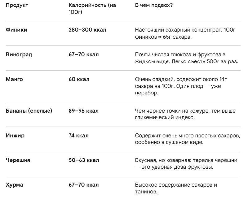 ) 🔥 Главные враги печени (анти-рейтинг) Сухофрукты (изюм, курага, финики): В процессе сушки из фрукта уходит вода, и концентрация сахара вырастает в 4–5 раз. Это фактически натуральные конфеты. Свежевыжатые соки: Главная беда. Мы убираем клетчатку (которая тормозит всасывание сахара) и оставляем «фруктозный сироп». Стакан апельсинового сока = 3–4 апельсина, съеденных за 10 секунд. Печень в шоке. 🤯 Консервированные фрукты: Там к природной фруктозе добавляется еще и сахарный сироп из банки. Что с этим делать? Не нужно исключать их навсегда. Просто относитесь к ним как к десерту, а не как к «полезному перекусу, который можно есть ведрами».