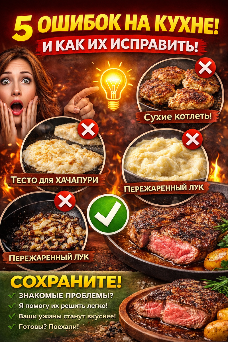 У вас когда-нибудь получались сухие котлеты или расползающееся тесто для хачапури? Вы не одиноки! Многие хозяйки сталкиваются с кулинарными неудачами, даже не подозревая, что причина — в мелких ошибках. Сегодня я поделюсь 5 самыми распространёнными промахами на кухне, которые легко исправить. Готовы превратить обычные ужины в кулинарные шедевры? Давайте начнём! Вы удивитесь, насколько просто избежать этих ловушек и готовить с удовольствием. Я собрала секреты, которые использую годами, — никаких сложных техник, только проверенные лайфхаки для домашней кухни. Готовы? Поехали! Почему так происходит? Чаще всего проблема в неправильном соотношении ингредиентов. Сухие котлеты — это не приговор! Вот как вернуть им сочность: ✅ Добавьте в фарш 1 столовую ложку сметаны — это сделает котлеты сочными. ✅ Используйте панировку из сухарей, а не муки — она удерживает влагу. ✅ Дайте фаршу постоять в холодильнике 30 минут перед жаркой — структура станет плотнее, а вкус — насыщеннее. Попробуйте: разниц