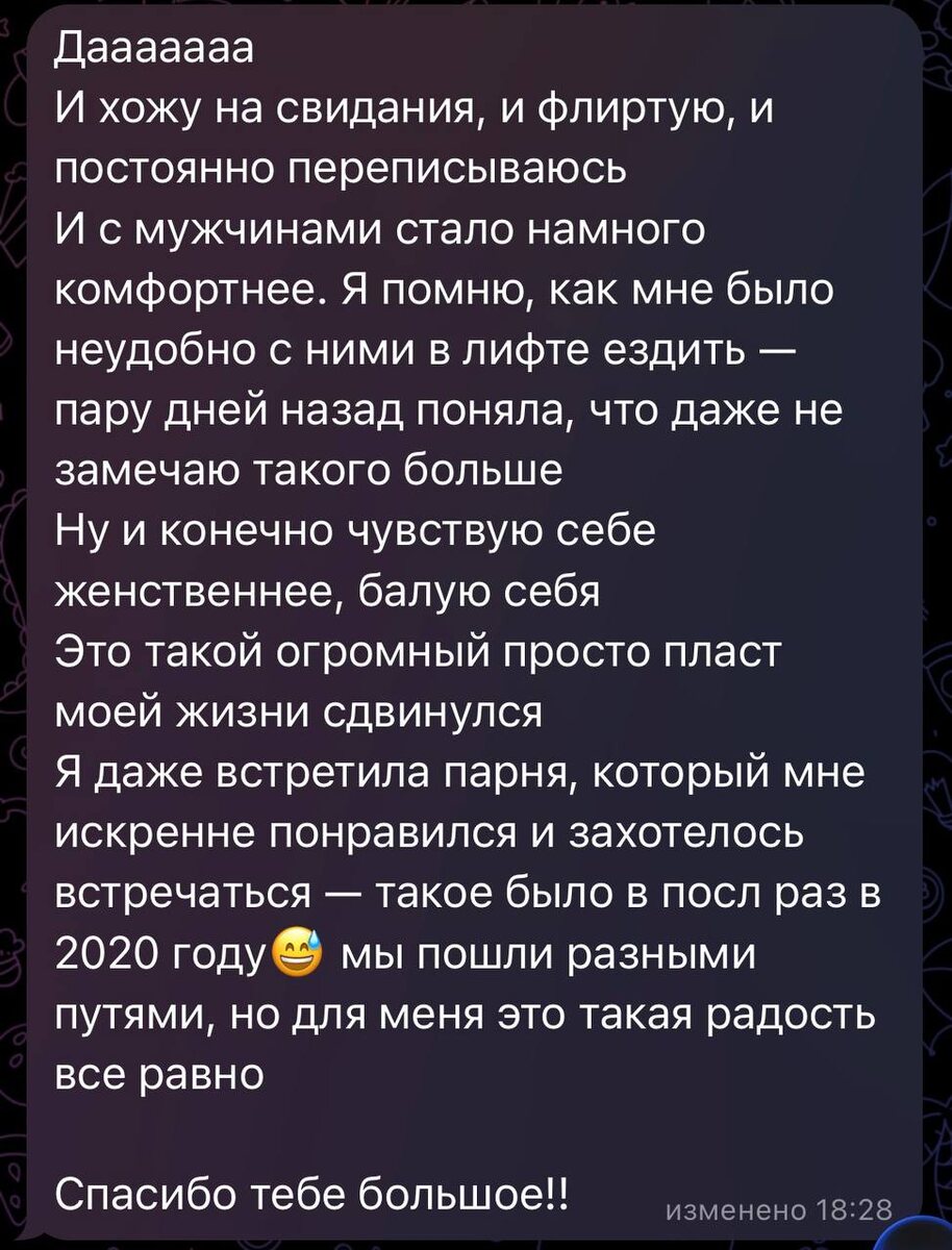 Я КАЖДЫЙ ДЕНЬ получаю положительные отзывы о работе со мной, которая идет сейчас, которая закончилась давно, а эффект ПРОДОЛЖАЕТСЯ!!! Это
