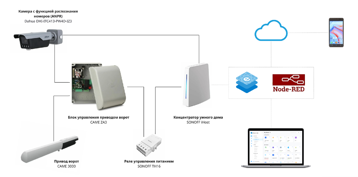 Недавно у нас во дворе появилась неожиданная задача. Я живу в обычной десятиэтажке — около 150 квартир. Территория закрытая, въезд через ворота. Раньше всё было просто: в будке сидел охранник и открывал ворота. Но стоимость услуг охраны выросла, и от этой схемы решили отказаться. Возник вопрос: как сделать так, чтобы свои машины заезжали автоматически, а чужие — нет? Не хотелось: В итоге решение получилось довольно простым: камера распознаёт номер → ворота открываются → в Telegram приходит уведомление. И всё это работает локально через Node-RED, который запущен на Sonoff iHost. На всю систему ушёл буквально один вечер настройки. Система состоит из трёх частей. На воротах стоит камера Dahua DHI‑ITC413‑PW4D‑IZ3. Она умеет распознавать номера прямо на борту (ANPR). Камера делает сразу несколько вещей: То есть решение открывать ворота принимает сама камера. Контроллер CAME получает сигнал от камеры и физически открывает ворота. Никакой дополнительной логики тут нет — просто исполнительный