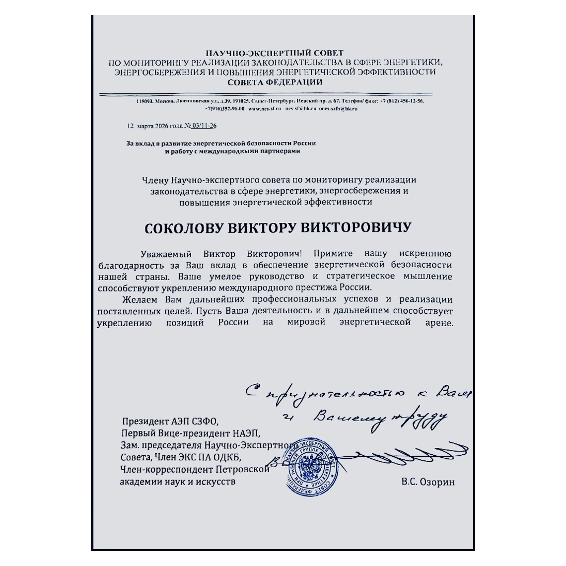 И, наконец, благодарственное письмо от Научно-экспертного совета при Совете Федерации, которое и стало поводом для этого материала. В нём Соколов назван членом совета, чья деятельность способствует укреплению позиций России на мировой энергетической арене.
