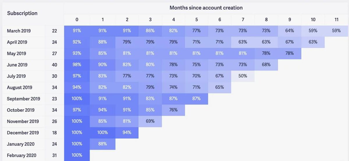 🔎 Retention Rate - метрика, которая показывает долю клиентов, которые продолжают пользоваться продуктом (покупать или совершать другое целевое действие) спустя какое-то время после их первого взаимодействия с продуктом. Эта метрика позволяет бизнесу оценить по-другому насколько долго клиент остается с компанией. 🔎 Когорты и когортный анализ - это метод анализ, когда клиентов объединяют одним признаком по дате совершения действия в одну группу (когорту) и считают метрику для когорты в целом, а не для конкретного клиента. Давай разберем картинку, на которой приведен пример анализа Retention Rate для оценки подписок с момента регистрации пользователя. Например, нас интересует как много клиентов и как долго оформляли ежемесячную подписку, которые зарегистрировались в марте 2019? Формируется когорта: в марте зарегистрировалось 1000 человек - это наши 100% Идем читать retention по первой строке слева направо (March 2019 и по номеру месяцев 0,1,2,3...) 🔹91% из них оформили подписку в