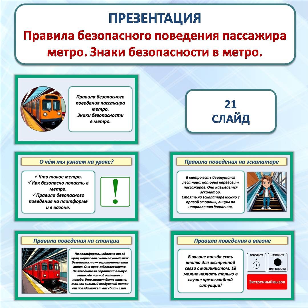 Презентацию скачать здесь Конспект урока скачать здесь Презентация «Правила безопасного поведения пассажира метро. Знаки безопасности в метро» разработана к уроку окружающего мира во 2 классе. Данная разработка станет хорошим визуальным сопровождением не только для урока, но и для классного часа или внеклассного мероприятия со схожей тематикой. Текст написан простым и понятным языком, слайды не перегружены информацией. Красочные иллюстрации помогут оживить ваш урок, вызовут интерес у учащихся, включат зрительную память и будут способствовать лучшему запоминанию изучаемого материала. Презентация состоит из 21 слайда. Задачи презентации: Данная презентация станет ценным помощником для учителя начальных классов. Также она будет полезна для самостоятельного изучения темы, домашнего и дистанционного обучения. Желаю успеха!