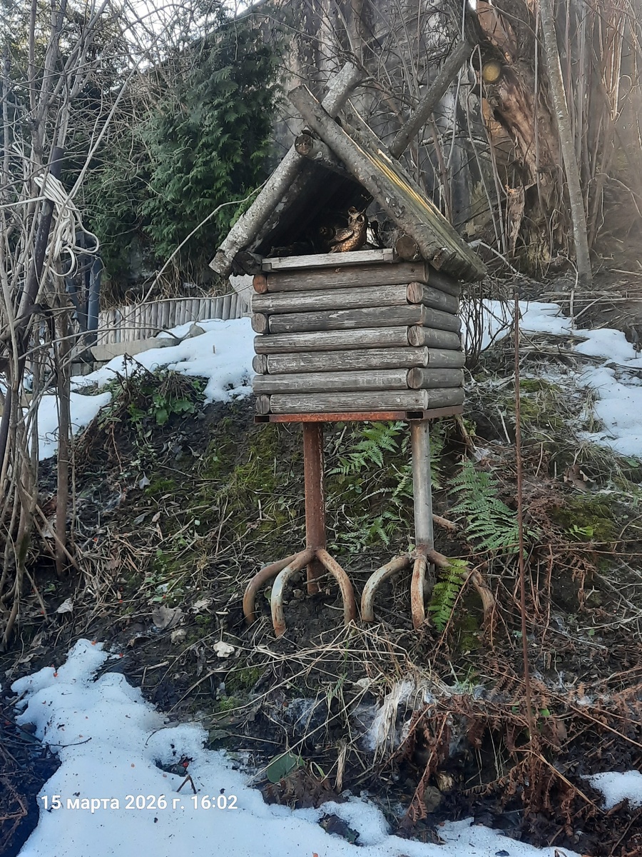 Несколько очень теплых дней. Половодье уже побежало дальше, а на склоне и на плоскогорьях, на которых снег срыт, уже просыпаются разные красивости. радующие взгляд! Вокруг избушки все растаяло! Сова всю зиму простояла на своем законном месте, не темнеет, не облезает. Умиляшка маленькая. Чуть подальше оттаивают зимнезеленые папоротники. Вот многоножка. Она нынче хороша, зелененькая, пушистенькая. Можжевелник еще сугроб не одолел. Многорядник шиповатый почти освободился. Дербянка колосистая уже колосится. Свеженькая! Листовик, хоть и в теньке растет, но чуть ли не раньше всех расправил свои вайи-листья. Дриада первую свою зимовку выдюжила, зеленеет. Живучка Чоколат чип в приличной форме. Я за сортовые аюги всегда немного переживаю. Зима на зиму не приходится. Вариегатная, как видите, не особо хорошо перезимовала. Осенью здесь была сплошная куртина аюги с белесыми листочками. На солнце посадить ее, что ли? Этот сорт у меня на первой зимовке. Где-то там написан. Не буду искать, уж пр