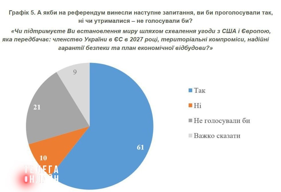 ? По данным Киевского международного института социологии, при условии скорого вступления в ЕС большинство украинцев (61%) поддержало бы референдум по мирному соглашению с Россией, предусматривающему территориальные компромиссы. Правда, ЕС к такому не готов. 🚲 Подпишись на Телега Online в MAX