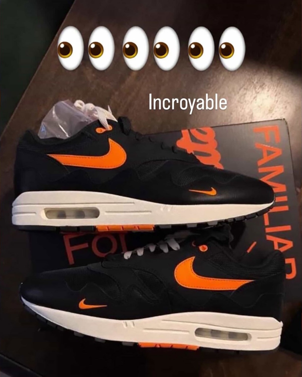 Амстердамский бренд Patta представил эксклюзивную расцветку кроссовка Nike Air Max 1 Waves для друзей и семьи. Модель выполнена в черной цветовой гамме с оранжевыми акцентами, продолжая тему «волн», которая была заметна в предыдущих версиях. На передней части модели просматривается фирменный «волновой» принт, а также небольшой логотип Swoosh в качестве цветового акцента. Расцветка выполнена в черном цвете с черными деталями, что делает некоторые элементы практически незаметными. Модель не будет доступна широкой публике.