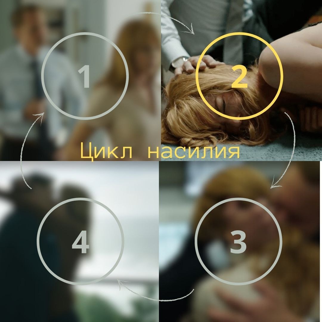 Для жертвы 2я фаза цикла, а именно сам эпизод насилия, разумеется, самая тяжелая. Не смотря на все усилия, приложенные жертвой в первой фазе, избежать насилия не получается. Вспышки гнева и эпизоды контроля насильника нарастают, и происходит взрыв. Тут, как правило, есть два варианта действий: либо жертва ждет, когда всё закончится, либо даёт отпор. Всё зависит от общего состояния человека, как эмоционального, так и физического. Например, Селеста из "Большой маленькой лжи" поначалу вступала с Перри в схватку, пыталась давать сдачи. На приеме у психолога такой способ проживания 2й фазы она описывала, как "Мы деремся. Я тоже его бью." С одной стороны, такая стратегия дает жертве больше ощущение силы, контроля, она не утопает в собственном положении, у нее есть чувство (часто, увы, иллюзорное), что она может за себя постоять. С другой - увеличивает риски. В ситуации насилия необходимо понимать, что цикл за циклом фазы будут становиться всё короче, а 2я фаза, сам эпизод насилия, всё ожесто