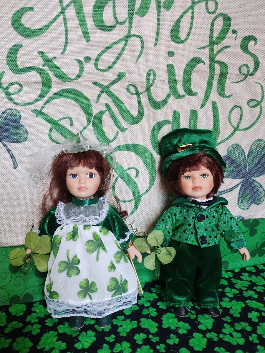 Всем доброго дня! День Святого Патрика широко отмечается в Америке. Этот праздник всегда 17 Марта. Во многих ам городах проходят праздничные парады. Это очень увлекательное зрелище. В прошлом году я ходила на парад в нашем городе и делала видео. Если кому интересно - можете посмотреть. В этом году парад у нас прошел заранее, в субботу 14 марта. Потому что резко испортилась погода, и снова пришла зима. Сегодня у нас выпал снег и минусовая температура. Тут уж не до парада на улицах. И нынешний парад я пропустила. Но зато сделала несколько интересных кадров на улицах города раньше, в частности возле дома моего уже знаменитого соседа Крэга. Да, он и на этот праздник поставил тематические декоративные фигуры на фасаде своего поместья. И эти фото я сейчас покажу. Многим моим подписчикам нравятся эти декорации, и я не обману их ожидания и сегодня. Но вначале я хочу показать небольшую фотосессию с двумя тематическим очень милыми куколками, выпущенную конкретно под этот праздник. Это маль