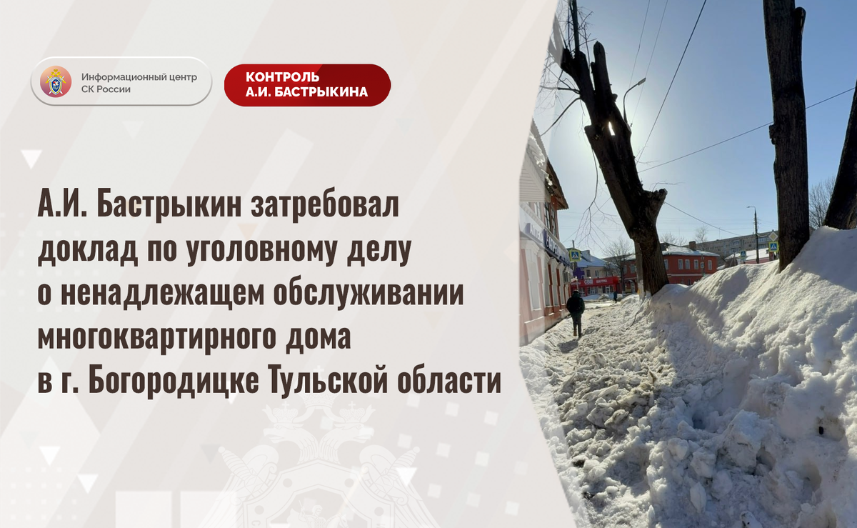 А.И. Бастрыкин затребовал доклад по уголовному делу о ненадлежащем обслуживании многоквартирного дома в г. Богородицке Тульской области В Информационный центр СК России обратилась жительница Тульской области по вопросу ненадлежащего обслуживания двухэтажного многоквартирного дома на улице Урицкого в городе Богородицке. В марте текущего года из‑за несвоевременной расчистки кровли здания от наледи произошло обрушение снежных масс на заявительницу и её новорождённого сына, находившегося в коляске. Ребёнку потребовалась медицинская помощь. В СУ СК России по Тульской области возбуждено уголовное дело. Председатель Следственного комитета Российской Федерации Александр Иванович Бастрыкин затребовал у руководителя СУ СК России по Тульской области Владимира Владимировича Усова доклад о ходе и результатах расследования уголовного дела. Исполнение поручения поставлено на контроль в центральном аппарате ведомства. #СледственныйКомитет #СКРоссии #СКР #ИЦСКР #ИнформационныйЦентр #АлександрБастрыкин