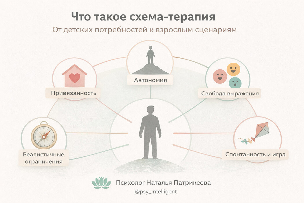 Схема-терапия, разработанная Джеффри Янгом и его коллегами, за последние три десятилетия превратилась из попытки модифицировать когнитивную терапию для сложных клиентов в полноценное, эмпирически подтвержденное направление. Центральная идея, вокруг которой строится вся работа, предельно проста и одновременно глубока: в основе психологического здоровья и патологии лежит степень удовлетворения базовых эмоциональных потребностей человека в период развития.