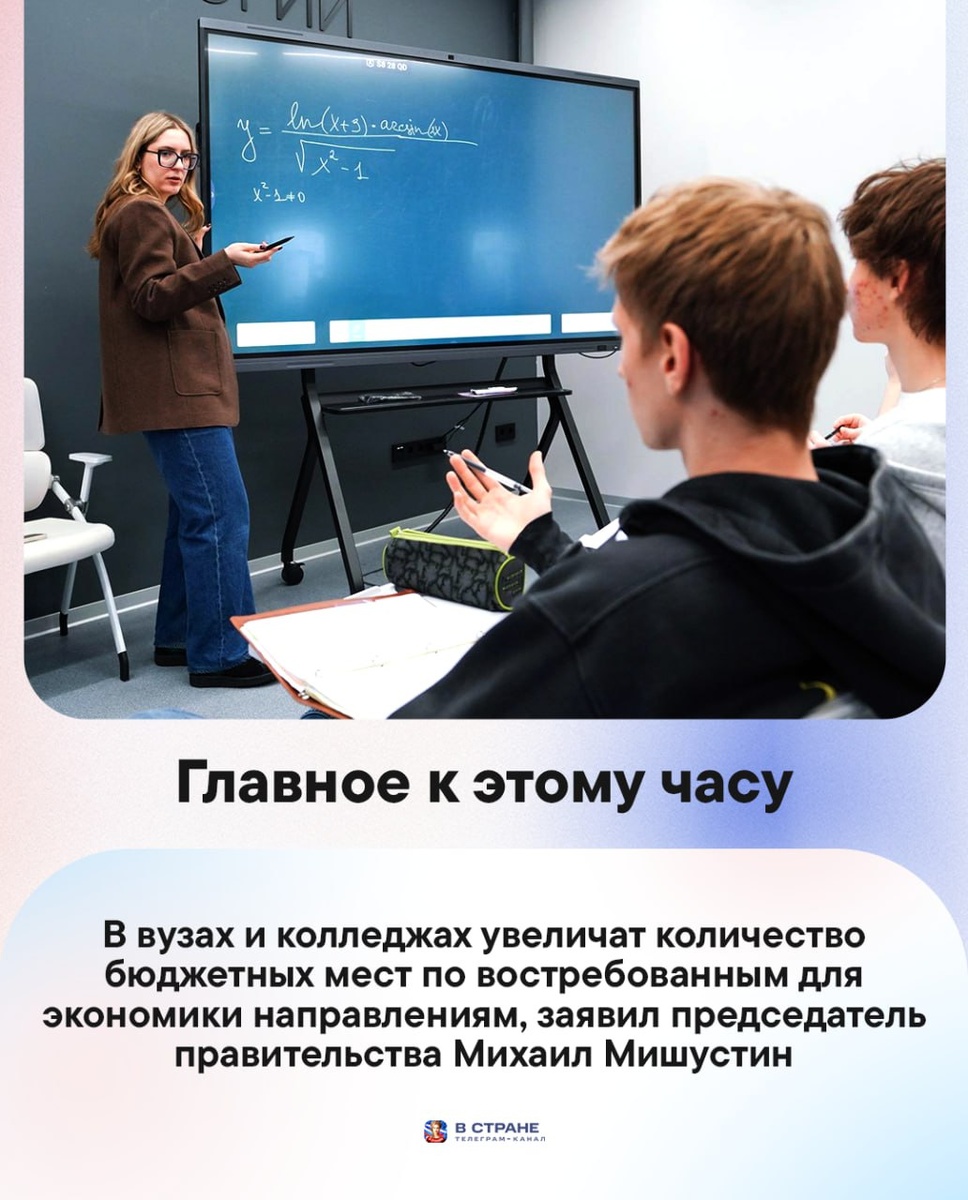 : 🔹В вузах и колледжах увеличат количество бюджетных мест по востребованным для экономики направлениям, заявил председатель правительства Михаил Мишустин. 🔹Два ветерана гребного спорта оказались под винтами речного трамвая во время катания на спортивном судне по Москве-реке. Один из них погиб. 🔹Wildberries хочет зарегистрировать в России товарные знаки для такси. 🔹Мурашко: потребление алкоголя в России за 16 лет снизилось в РФ в 1,7 раза. 🔹Певица Лариса Долина подала иск о возмещении имущественного вреда на 176,1 млн руб. 🔹В Курской области женщина получила ранения при атаке украинского дрона. ✅ «В Стране» в MAX