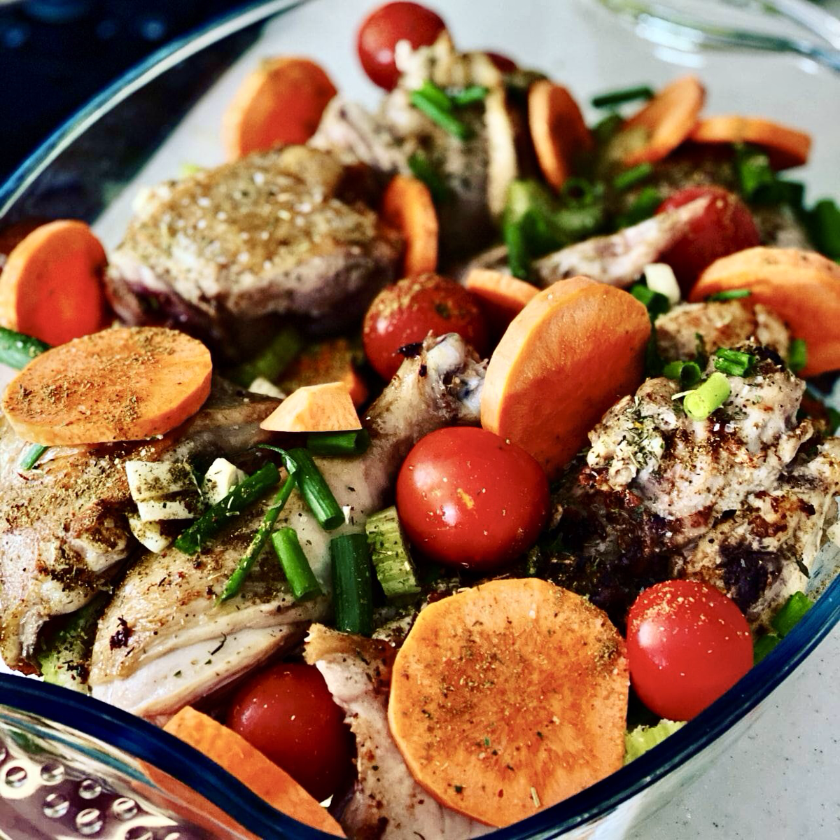 Ингредиенты: ▫️куриные голени — 1 кг ▫️морковь — 2 шт. ▫️лук зеленый — 1 пучок ▫️лук белый — 1 шт. ▫️чеснок — 1 шт. ▫️сельдерей зелень — 3 шт. ▫️помидоры черри — 10 шт. ▫️томатная паста — 1 ч. л. ▫️тимьян сушеный — 1 веточка ▫️сливочное масло — 50 г Способ приготовления: 1. Куриные голени промыть, просушить с помощью бумажных полотенец. Обжаривать на сильном огне с добавлением сливочного масла в течение 5 минут. Затем курицу переложить в противень (если у вас глубокая сковорода со съемной ручкой, то в противень можно не перекладывать). 2. Все овощи нарезать крупно, кроме черри. Выложить сверху на куриные ножки. Томатную пасту развести в стакане воды, залить овощи и курицу. Помидоры выложить сверху целиком. Посолить и поперчить по вкусу. Ставим в предварительно разогретую до 200°C духовку на 40–50. Приятного аппетита!