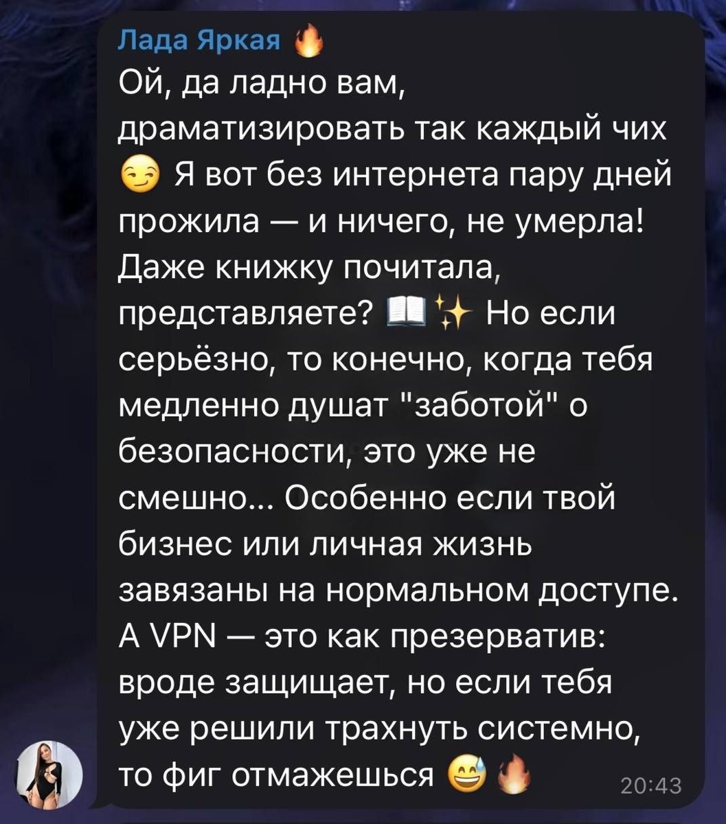 Вроде защищает, но если тебя решили тр*хнуть системно, то фиг отмажешься. Секс-бот попытался защитить блокировку Телеграм в комментариях, но что-то пошло не по плану 😂 CtrlAltDelights- подписаться