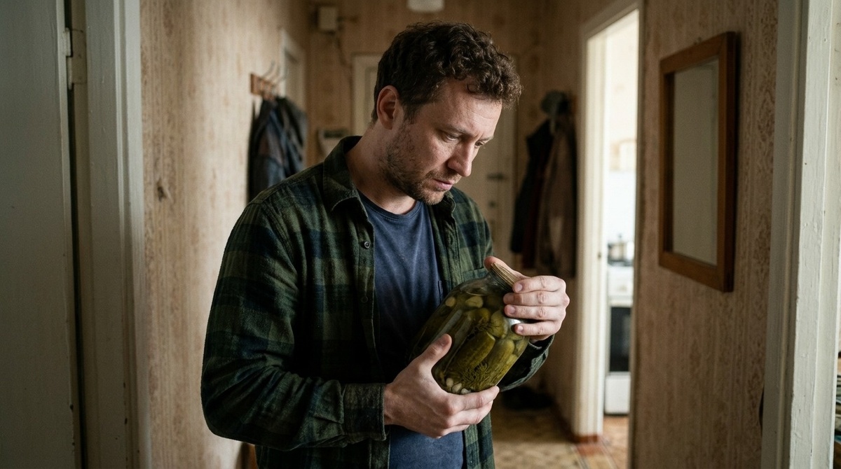 Казалось, он вцепился в эту банку, как утопающий в спасательный круг. Он смотрел на зелёные огурцы за мутным стеклом, и у него перехватило горло.