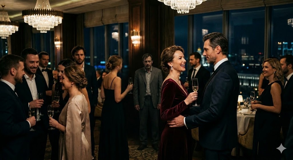 В центре внимания, окруженная толпой солидных мужчин в смокингах, стояла женщина. Она смеялась, держа в руках бокал шампанского. На ней было потрясающее платье цвета бордо, открывающее красивую линию плеч. В каждом её движении читалась уверенность и грация королевы.