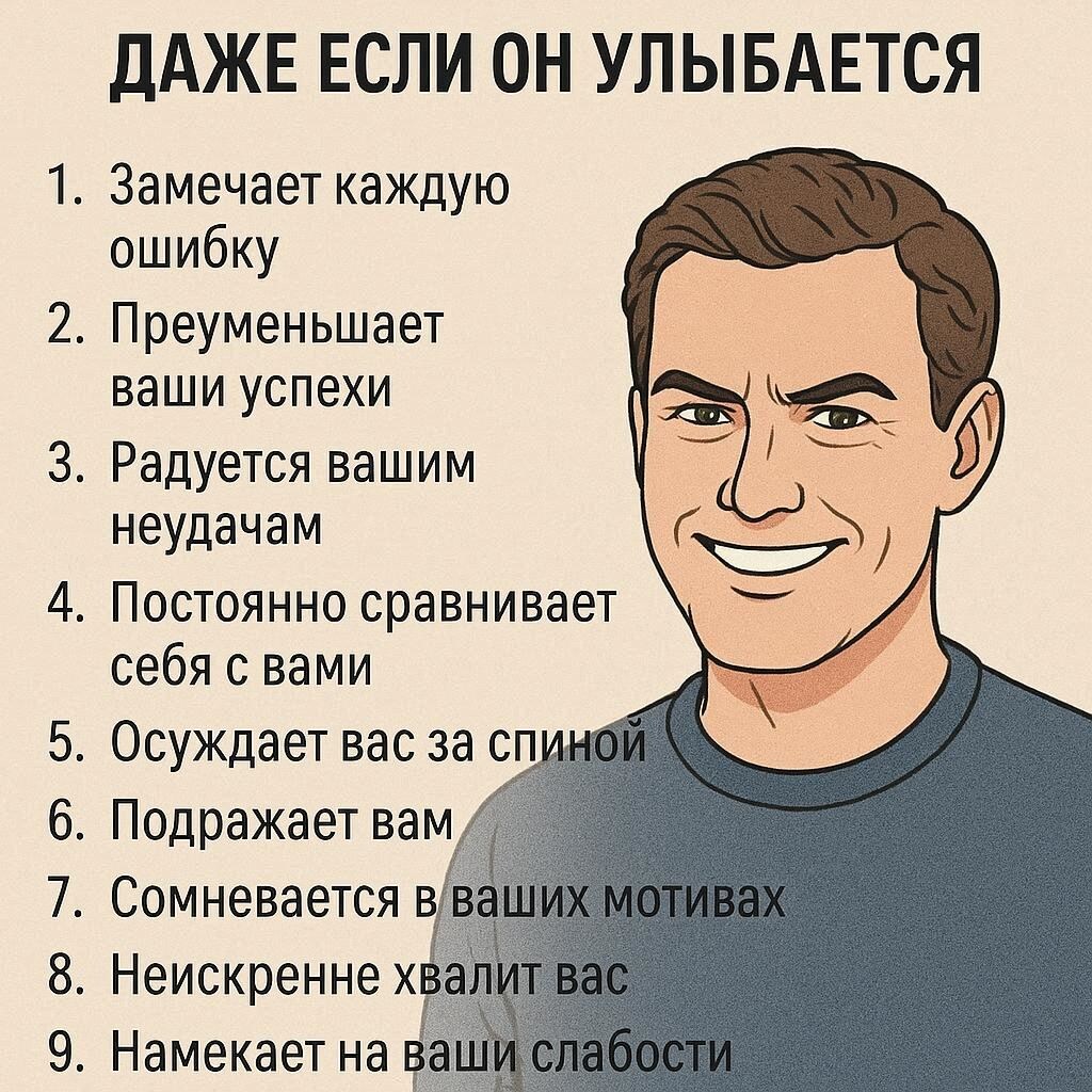 Но при этом внутри может испытывать совсем другие эмоции. Психологи говорят, что зависть часто проявляется в мелких деталях поведения. Иногда они настолько незаметны, что люди долго не понимают, почему после общения остаётся неприятное ощущение. Вот несколько признаков, которые могут говорить о скрытой зависти. Когда вы рассказываете о хорошем событии — новой работе, покупке или достижении — реакция такого человека выглядит странной. Он может сказать «молодец» или «поздравляю», но без эмоций. Иногда разговор быстро переводится на другую тему. Завистливые люди часто сравнивают себя с другими. Фразы вроде: звучат довольно регулярно. Такие слова помогают им уменьшить значимость чужого успеха. Иногда зависть проявляется через шутки. Например: На первый взгляд это выглядит безобидно, но в таких фразах часто есть скрытый укол. Это один из самых явных признаков. Если что-то у вас не получилось, такой человек может проявить неожиданно активный интерес. Он задаёт много вопросов и иногда даже вы