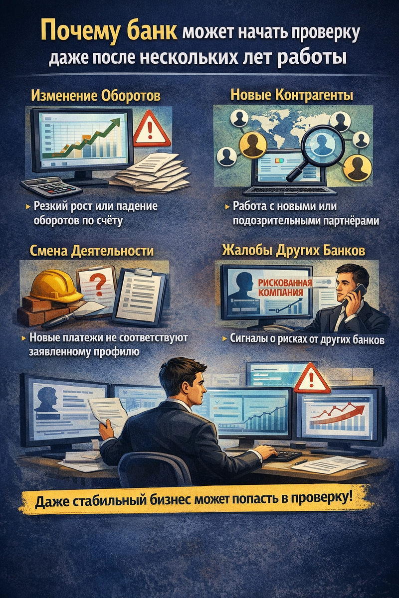 Многие предприниматели уверены: если компания спокойно работает с банком несколько лет, значит риск проверок уже позади. На практике это не так.