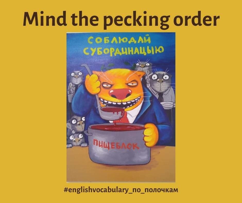 «Соблюдай субординацыю» – написано на картинке Васи Ложкина. «Соблюдай суПординацию» – прочитала я. И тут же подумала, что в английском языке есть фраза, описывающая иерархию как раз через порядок подхода к кормушке: pecking order – дословно «порядок клевания». В этом офисе существует четко установленная иерархия. Он начинал клерком, но постепенно продвинулся по служебной лестнице. Глагол peck означает «клевать», образованное от него прилагательное – peckish - слегка проголодавшийся: Если ты проголодался, в холодильнике есть сыр. К десяти часам я проголодался, хотя плотно позавтракал. Решила про это написать. Залезла в гугл за ссылками и с удивлением обнаружила, что pecking order описывает скорее всего не порядок клевания зерна, а порядок клевания собратьев. Это про то, кого ты можешь клевать, не опасаясь за это огрести, и кому ты позволяешь клевать себя, потому что таково твоё место в иерархии: The pecking isn't of food but of each other. Hens are social animals and form themselves in