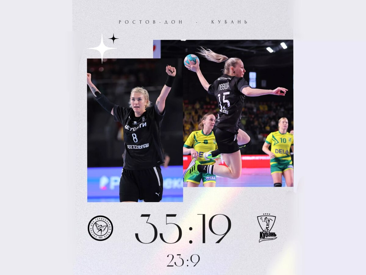 «Ростов-Дон» одержал уверенную победу в четвертьфинале Суперлиги на домашнем матче с «Кубанью». Игра прошла 16 марта во «Дворце Спорта». Счет был открыт уже через 30 секунд после стартового свистка, и донская команда не сбавляла оборотов всю игру. К перерыву после первого тайма на табло горели цифры 23:9 — преимущество в 14 мячей. После отдыха тренерский штаб дал возможность проявить себя всем, и темп игры немного снизился — команды спокойно обменивались результативными атаками. Но главная интрига вечера развернулась вокруг линейной Кристины Кожокарь. До игры на счету 63-го номера значилось 999 голов за ростовский клуб. Увы, исторический тысячный мяч в этот вечер так и не случился: удача отвернулась от спортсменки. Главным снайпером встречи стала Алина Кишко, которая шесть раз заставила капитулировать вратарей «Кубани». Финальный свисток зафиксировал разгромный счет 35:19 в пользу хозяек. Ответный матч 1/4 финала пройдет в Краснодаре 22 марта. Начало встречи в 16:00 по московскому врем