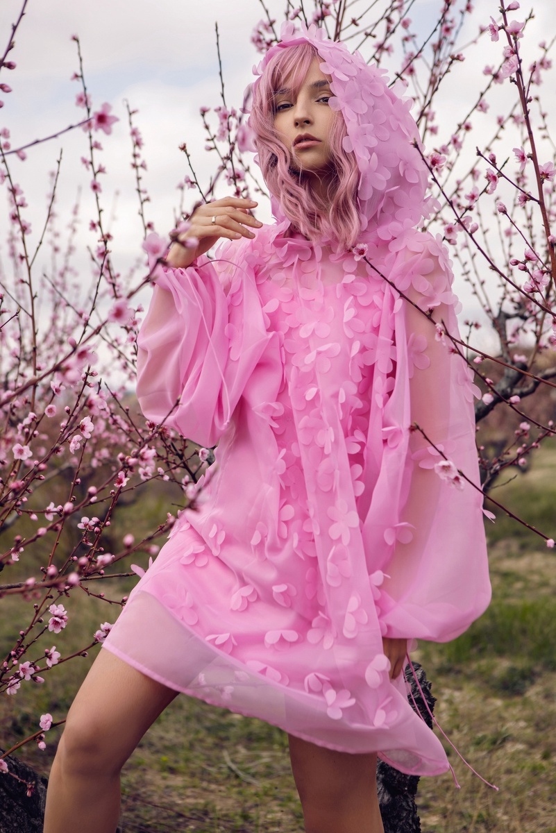 Апрель 2021. В цветущих садах в Крыму я хотела сделать съёмку ооочень давно. Наконец-то мы запланировали поездку в Крым на весну 2021. Я начала продумывать съёмку и готовиться. Хотелось сделать необычные фото и я сразу же отмела для образа платье с длинным шлейфом. В голове нарисовался образ с воздушными цветами из шифона на платье. Опять же, никогда не шила ничего подобного и решила экспериментировать с шифоновыми цветами. Изучив разную информацию я поняла, что такие цветы лучше всего вырезать детским выжигателем. Не помню сколько недель ушло на вырезание всех цветочков, но оно того точно стоило. Собрав всё воедино получилось именно то, что я хотела увидеть по итогу. Единственное что мне не нравилось, это мои черные волосы, которые совершенно не вязались с нежным образом. И тут меня осенило добавить в образ парик, конечно же розовый) получилось то что нужно. День съёмки. Мы прилетели в Крым в середине апреля с надеждой на тепло и весну. Я рассчитала приблизительно даты цветения садов.