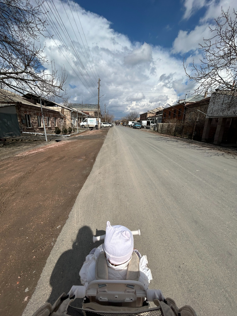 Наша улица - это единственная асфальтированная улица в деревне (не считая главную трассу). По законам Армении улицы, на которых расположены школы или кладбища, должны быть асфальтированы. В конце нашей улицы находится кладбище. Асфальт положили как раз через месяц после того, как мы купили дом. Улица наша носит имя армянского поэта Егише Чаренца. Протяженность улицы 900 метров, пешком за 10 минут можно пройти. Дома встречаются разные. Есть вот такие вот добротные двухэтажные с кондиционерами, солнечными панелями. Есть и вот такие старенькие, с деревянными рамами, печным отоплением. В таких домах тоже живут. Вообще на нашей улице только один нежилой дом, но его даже домом сложно назвать, только стены, ни крыши, ни окон. Есть и недавно отремонтированный дом. Отремонтировали кстати очень быстро, недели за 3. Был тоже в плохом состоянии. Есть вот такой интересный дом с теплицей на крыше. Есть несколько домов таких - недостроев. Было хорошее время, когда курс рубля был 1 к 13. Те, кто