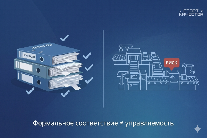 Самое сложное здесь — собственник видит только внешнюю сторону: аккуратные папки, отчётность, закрытые журналы. И делает естественный вывод, что процессы под контролем. Но контроль — это способность видеть отклонение в момент его возникновения, а не после того как оно уже стало проблемой.