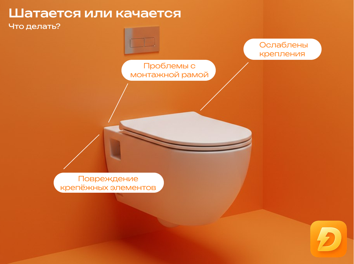 Даже если инсталляция изначально установлена правильно, со временем болты могут ослабнуть. Под весом человека это приводит к шатанию. 2. Проблемы с монтажной рамой