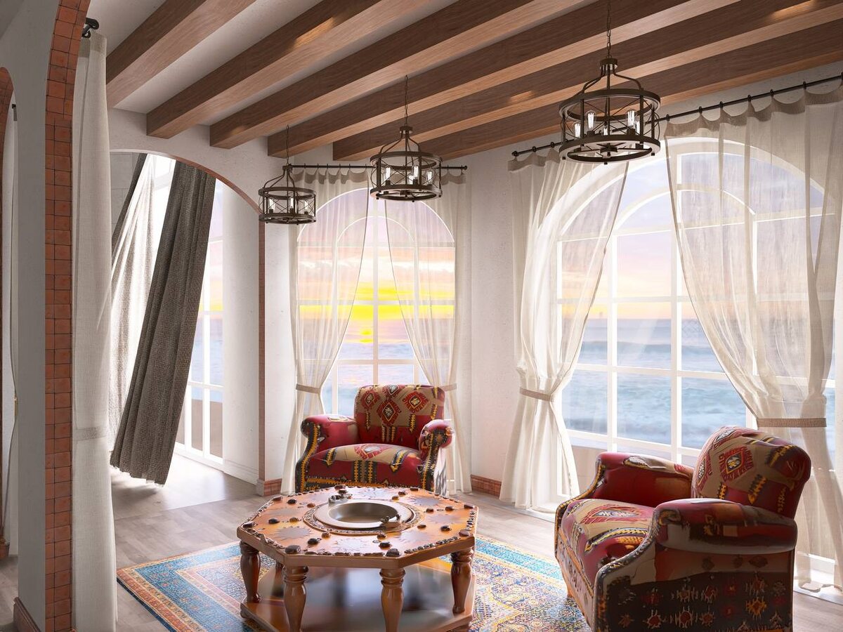 Это винный атриум. В своём дипломном проекте Алиса Яковчук разработала винный атриум - место, где архитектура, свет и фактуры создают особое ощущение уюта и камерности. В проекте использованы тёплые природные материалы: дерево, текстиль, мягкий свет и фактурная мебель. Арочные окна открывают вид на море и наполняют пространство естественным светом, а потолочные балки и подвесные светильники добавляют интерьеру характер и глубину. Центром композиции становится зона отдыха с мягкими креслами и винным шкафом - пространство, где можно остановиться, провести вечер за разговором и бокалом вина. Такие проекты - результат не только творческого подхода, но и серьёзной работы с планировкой, атмосферой и деталями. И для нас всегда особенная радость видеть, как идеи студентов превращаются в полноценные дизайнерские проекты. 💬 Как вам атмосфера этого пространства?
