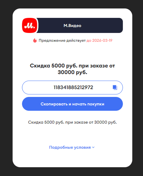До 19 марта 2026 в М.Видео проходит раздача промокода на скидку 5000₽ от 30 000₽ на повторные заказы. Промокод могут получить все пользователи и применить на огромный каталог товаров. Для того, чтобы получить промокод нужно перейти по ссылке и нажать на кнопку "Скопировать и начать покупки", после этого вам будет выдан уникальный промокод. Далее нажмите еще раз на кнопку, чтобы попасть в каталог М.Видео. ➡️➡️➡️ПОЛУЧИТЬ ПРОМОКОД Промокод одноразовый и действует только по технику по ссылке. Если вам нужен еще один промокод, то вы можете перейти по ссылке на следующий день и взять новый.