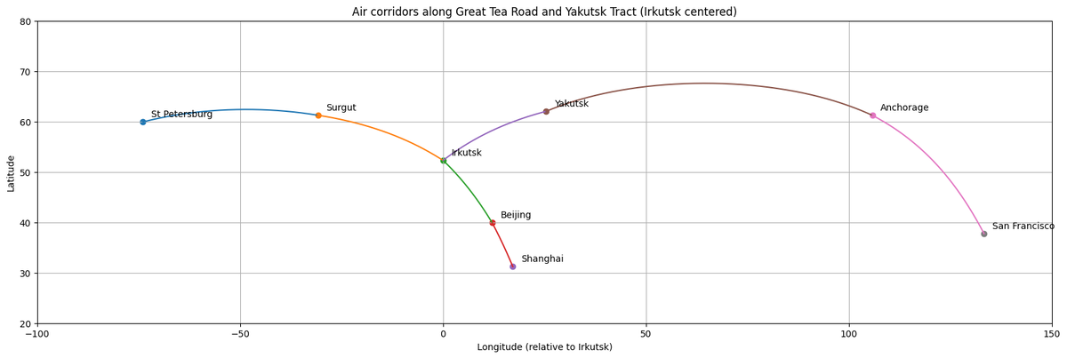 Что соответствует текущей ситуации блокады со стороны запада, с возможным её преодолением, путем создания торговых путей до Петербурга. Кроме того чайный путь взаимодействовал с американской торговлей. Пушнина с Аляски, чай из Китая сходились в Иркутске, и участвовали в товарообороте. Современные корабли летают по воздуху, так что экономическое значение прежде всего имют авиамаршруты, по шелковому пути они уже выстроились. Для чайного пути рыночная экономика тоже формирует связи, в обход атак дронов и санкций, но сталкивается с активным сопротивлением чиновничьего класса. Поэтому нужны свежие кадры, и новый логистический центр в Иркутске, где предстоит построить новый аэропорт, где уже формируется логистический узел для контейнерных перевозок по железном и автодорогам.
