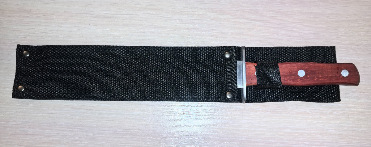 Увидел тут на Озоне подборку ножей какого то Мамонтова. Ножей много и разные. Ну и решил познакомиться так сказать с этой продукцией. Тем более цены вполне демократичные. Сказано, сделано. Заказал большой туристический нож. Посмотрим, что из этого получилось. Нож пришел быстро. В простой упаковке и вот в таких невзрачных ножнах из кордуры. Достаем его и видим вот такой небольшой меч-кладенец длиной 35 сантиметров. Длина лезвия 23,5 сантиметра. Толщина обуха 3 миллиметра. А вот тут и кроется дьявол в деталях. В обухе то он вроде нормальной толщины, а вот лезвие обоюдоострое и очень тонкое. Прямо тоньше некуда. Гнется как рябина на ветру, несмотря на долы с обоих сторон. Заточка острая, не обделили. На лезвии знак фирмы. Есть прямой ограничитель. Ручка из простой древесины. Раньше помню из такой делали ручки советских кухонных ножей. Ручка из двух половинок. Скреплены заклепками. Для большой руки ручка будет коротковата. И узка. На вид конечно нож очень грозный. Но легкий. Для как
