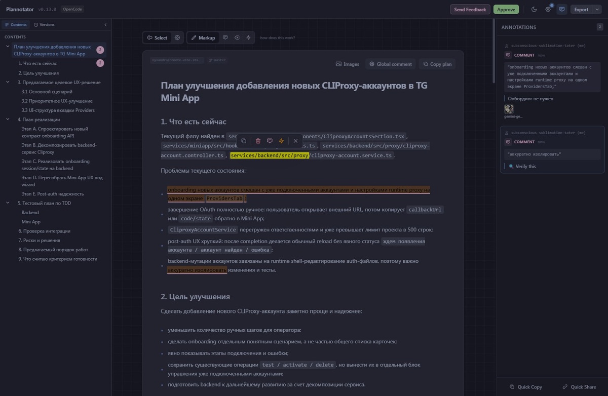 Посвятил вечер тому, что тестировал плагины для OpenCode в поисках полезных и для отметки себе, какие делать не нужно (а я любитель писать "велосипеды"). Наткнулся на удобный инструмент по работе в режиме планирования, которого мне не так хватало. Если не ошибаюсь, то только Antigravity сейчас подобное предоставляет (возможно еще Cursor, но он в прошлом). Как пользоваться: в OpenCode есть 2 агента по умолчанию, для написания кода "Bulid" и для планирования "Plan". Когда мы переключаемся на агента Plan - то он составляет достаточно подробную спецификацию/план/записку, сам открывает вкладку в браузере и предоставляет нам на ревью. Можно выделить текст, прокомментировать, удалить лишнее, или же прикрепить картинки, как референс. Затем план либо отправить на повторную проработку, либо подтверждаем план, и тогда агент сразу переключается на "Bulid" и приступает к реализации плана. Есть поддержка интеграции с Obsidian. 🔗 Plannotator - плагин для OpenCode