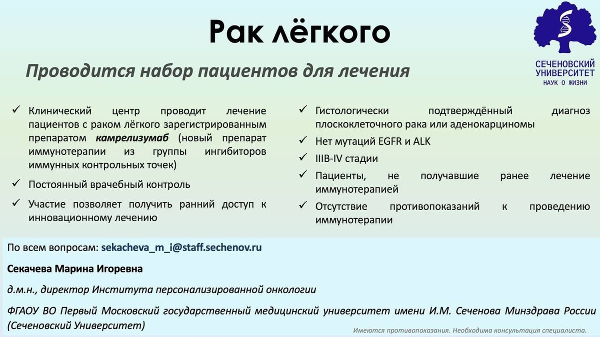 - важно исследование на EGFR и ALK заранее - желательна сдача анализа на PD-l1 статус - лечение проводится по ОМС, необходима форма 057у от онколога по месту жительства - все анализы можно сдавать по месту жительства