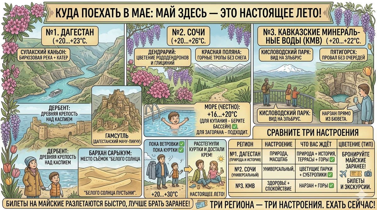 Пока большая часть страны ещё куталась в ветровки, в трёх регионах России давно расстегнули куртки и достали солнцезащитный крем. Май здесь — это настоящее лето: +20…+30°C, цветущие горы, бирюзовые каньоны и столы, ломящиеся от свежих овощей и зелени. Рассказываем, куда ехать, если уже не терпится. Пока Москва и Питер ещё в куртках, на юге России +20…+25°C, горы в цвету и бирюзовые каньоны. Вот три места, куда стоит ехать в мае. Май — лучший месяц для поездки. Летом в каньонах жара под +40°C, в мае тепло, зелено и туристов мало. Главное зрелище — Сулакский каньон: глубже американского Гранд-каньона на 63 метра, внизу бирюзовая река, можно спуститься на катере. Дербент — один из старейших городов России — стоит прямо над Каспием, крепость Нарын-Кала VI века видна издалека. Если хочется чего-то необычного — аул-призрак Гамсутль на вершине горы, дагестанский Мачу-Пикчу, и бархан Сарыкум, где снимали «Белое солнце пустыни». 👉 Авиабилеты в Махачкалу