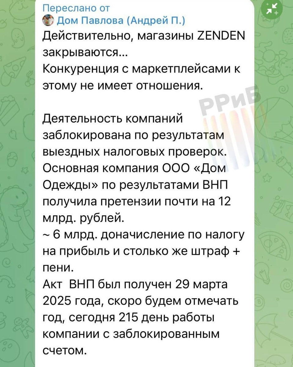 Все магазины обувной сети Zenden закрываются в течение 1 месяца Увы, я был не прав, Зенден загнобили налогами! 😔 Владелец компании Андрей Павлов пишет, что счета компании заблокированы уже 215 дней, штат сократился с 3500 до 1500 человек, а ежедневные убытки превысили 10 млн рублей. По его словам, таким темпом в течение месяца закроются практически все магазины. Сеть насчитывает около 280 магазинов в более чем 125 городах России. Деятельность компании заблокирована после выездной налоговой проверки: основной компании предъявили претензии почти на 12 млрд рублей — около 6 млрд доначислений по налогу на прибыль и столько же штрафов и пеней. Как это развивалось. Павлов настаивает, что компания не допускала нарушений и не пыталась уклоняться от налогов. На результаты проверки поданы возражения, а материалы направлены в ФНС. Желаю компании выживания, а сотрудникам сохранить рабочие места.