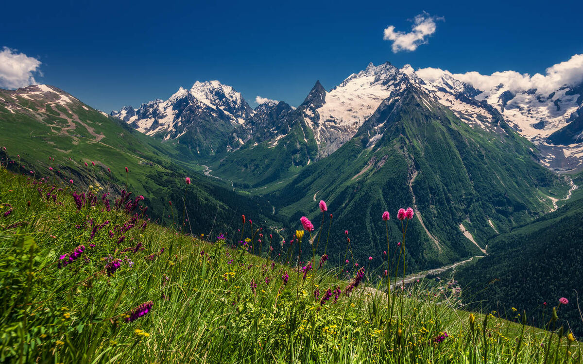 Представьте: над головой — пронзительно-синее небо, под ногами — тропа, вьющаяся среди изумрудных лугов, а вокруг — вершины, покрытые вечными снегами. Слышите, как шумит горный поток? Чувствуете аромат хвои и горных трав? Добро пожаловать в Кавказские горы — место, где природа говорит с душой на языке красоты и силы.