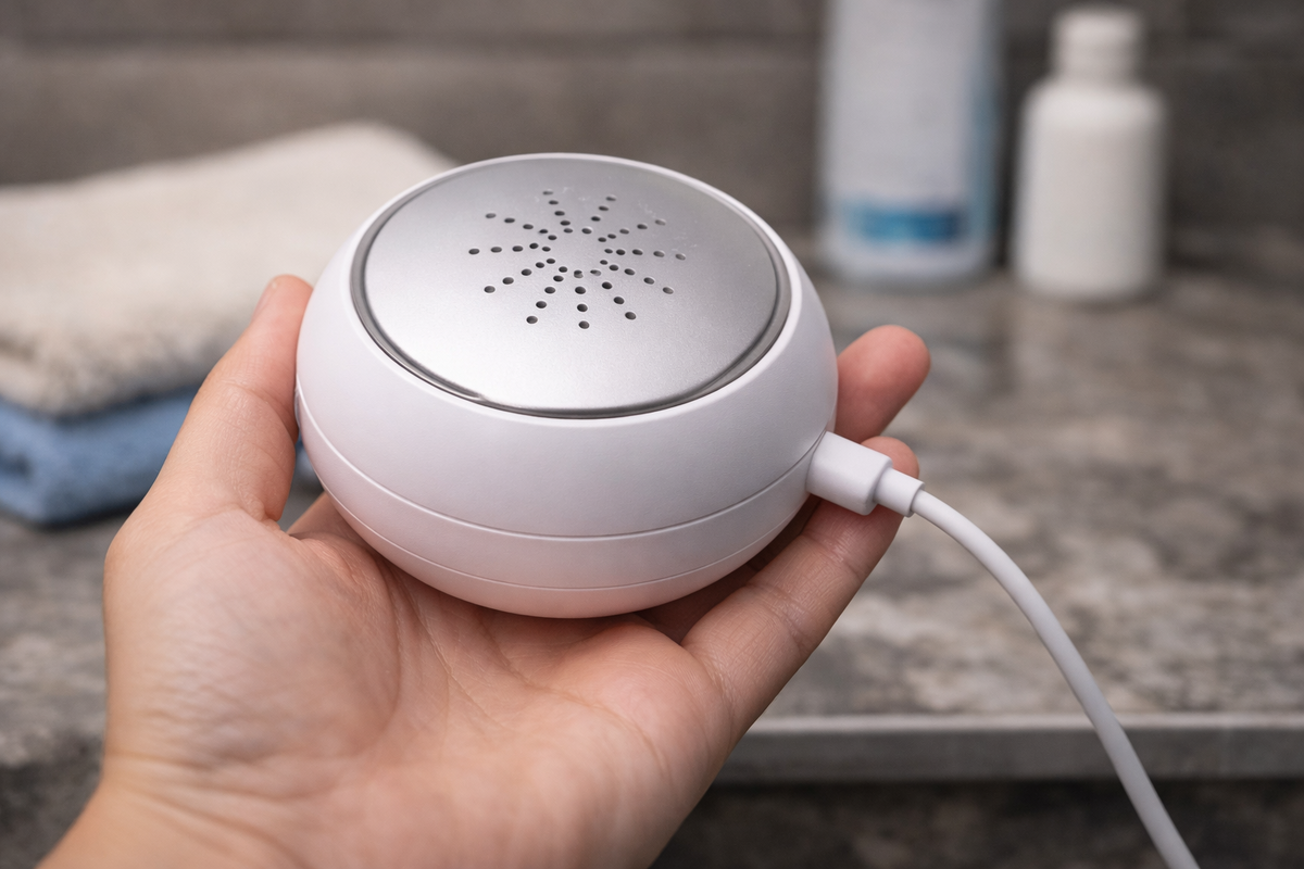 Это маленькое устройство кладётся прямо в таз с водой или небольшую ёмкость, подключается к питанию — и начинает стирать вещи с помощью ультразвуковых колебаний.