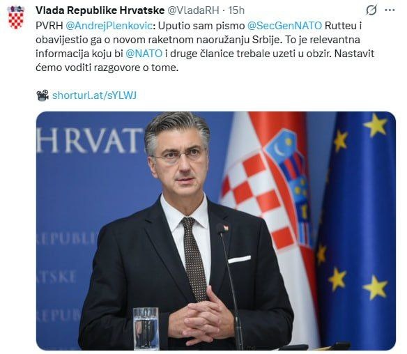 🇭🇷🇷🇸 Премьер-министр Хорватии Андрей Пленкович обратился к генеральному секретарю НАТО Марку Рутте, написав письмо, в котором