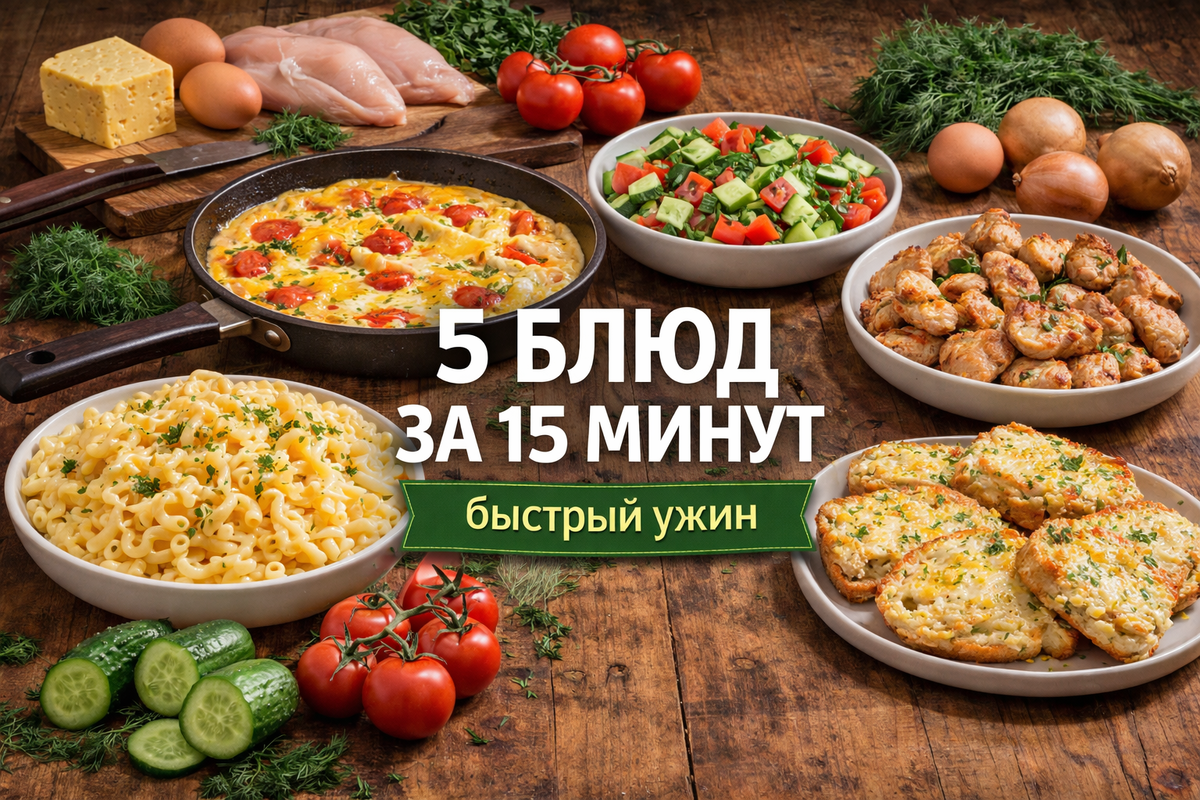 Сегодня делюсь 5 проверенными блюдами, которые можно приготовить примерно за 15 минут. Все рецепты простые, с точными граммовками и понятными шагами.