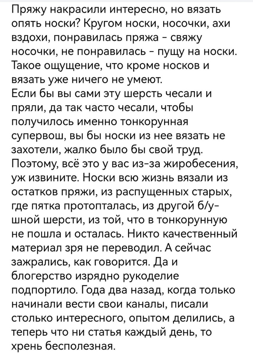 Вот. Человек критикует современное многообразие пряжи, называя это "жиробесением", и вспоминает времена, когда носки вязали из остатков и распущенной шерсти. Мол, раньше люди не привередничали, а сейчас "зажрались" и требуют специальную пряжу под каждую задачу. Читайте сами: