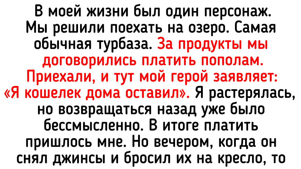 В моей жизни был один такой персонаж. Мы решили поехать на озеро. Самая обычная турбаза, без каких-либо изысков. Машины у него не было, поэтому за рулем была я. Расходы на бензин я взяла на себя — все-таки автомобиль мой. За продукты мы договорились платить пополам. Приехали на место, и тут мой герой заявляет: «Я кошелек дома оставил». Хотя изначально мы договорились, что все расходы делим 50 на 50. Я растерялась, но возвращаться назад уже было бессмысленно. В итоге платить пришлось мне. Окончательно мое терпение лопнуло вечером, когда он снял джинсы, бросил их на кресло, и из кармана на пол выпал его кошелек. © Milady89 / Pikabu